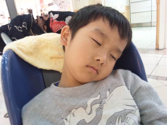 嫁と子どもは歩き疲れてベンチに座ってうとうと