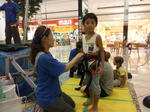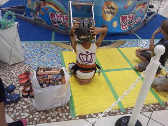 を買うという約束をしていたので、その足で東浦のイオンに行きました。イオンのホールではいつもいろんなイベントをしていますが、今日は逆バンジーのようなことをやっていました。体重制限(55Kg)があったので僕はできませんでしたが晴輝が挑戦することになりました